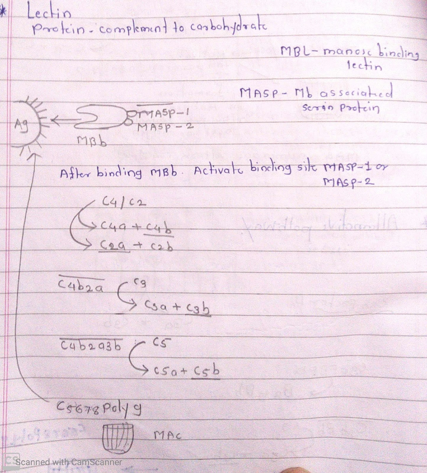 Antigen bearing mannose residue comes in the body serum protein known [MBL] bind to mannose residue then two serum protein bind to MBW called as MASP-1, MASP-2 [MBL associated serum protein 1 and 2] MASP 1 and 2 have 2 substrate C2 and C4 compliment protein they clues then C4a and C4b and C2a and C2b, C4b and C2a forms complex of surface on antigen which is also called as C3 convertase C4b2a bar gains the activity to degrade C3 protein therefore it is also known as C3 convertase clues 3a and C3b. C3a is smaller fragment which is dissociated in the serum C3b is larger fragment bind to C3a convertase (C3b2a) forming trimer C4b2a3b bar this trimer has ability to degrade C5 protein therefore it is known as C5 convertase. C5 convertase Can clues C5 protein into C5a and C5b is smaller fragment which is again dissociated and larger C5b protein sequence bind it to forming complex (C5bC6C7C8) C5b6789 complex has to ability gent inserted into membrane of antigen after getting the inserted into membrane multiple molecule of C9 protein bind to this complex forming C5b678 polynight this complex is also known as membrane attack complex which is form longer pore in the membrane of antigen and hence antigen is lised and killed